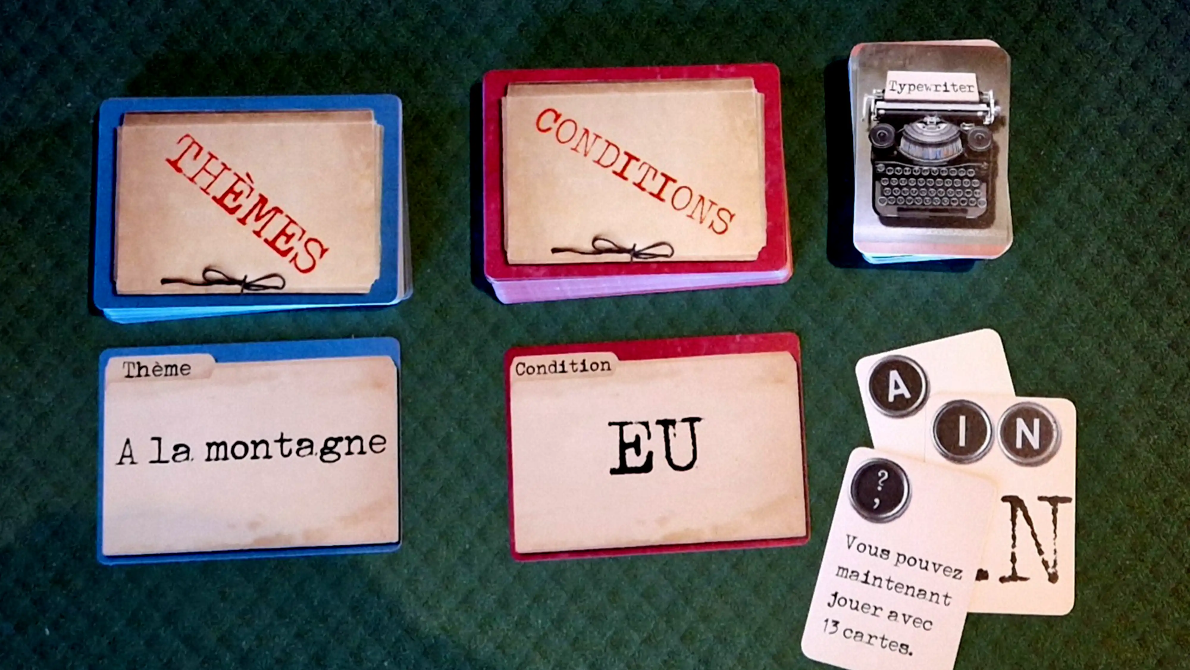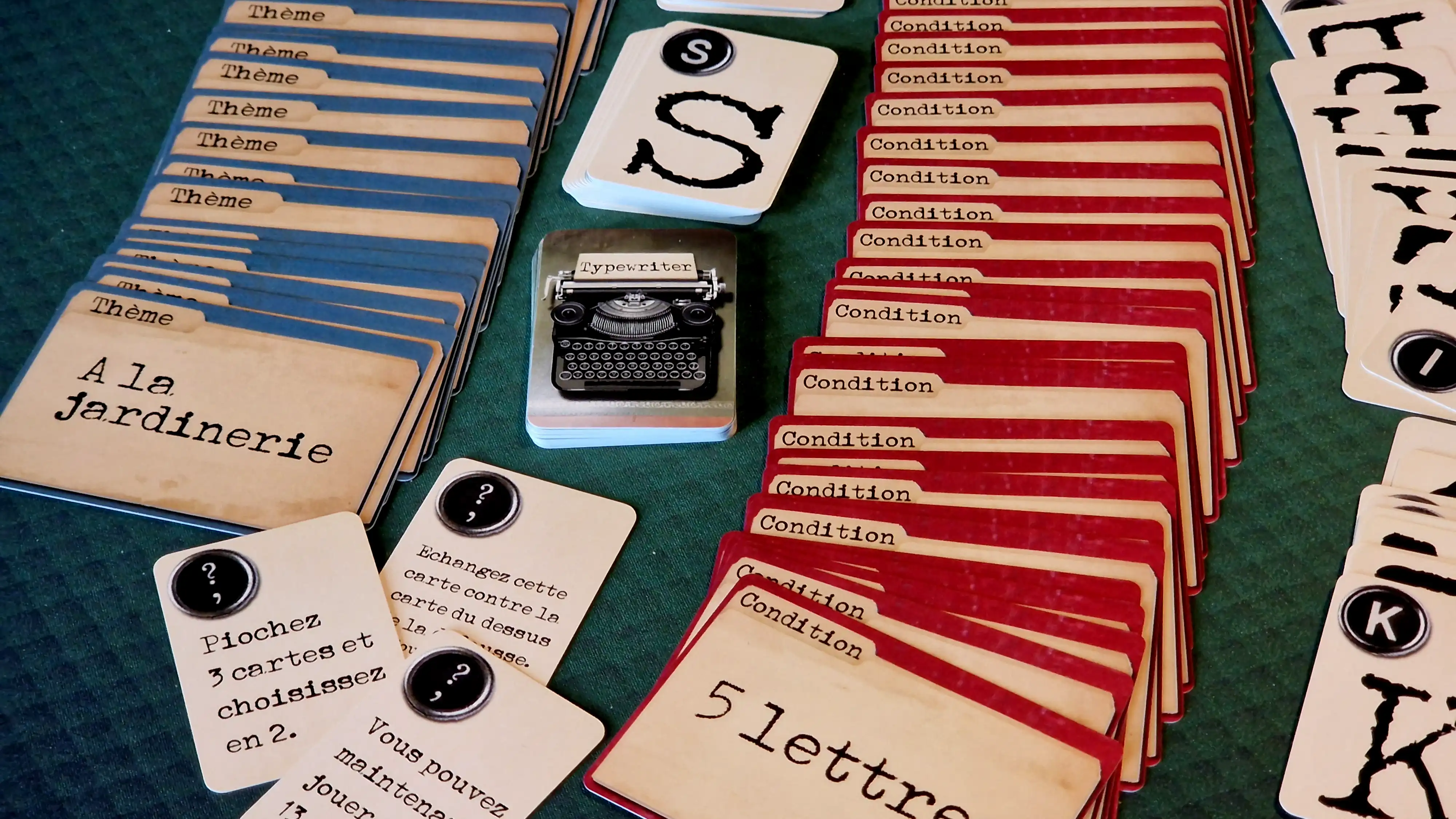 Chaque partie est influencée par une carte “thème” et une carte “condition”, modifiant les critères de score. “À la mer”, “Avec un verbe”, “En cinq lettres” : autant de défis qui stimulent la créativité et garantissent des parties toujours renouvelées.
